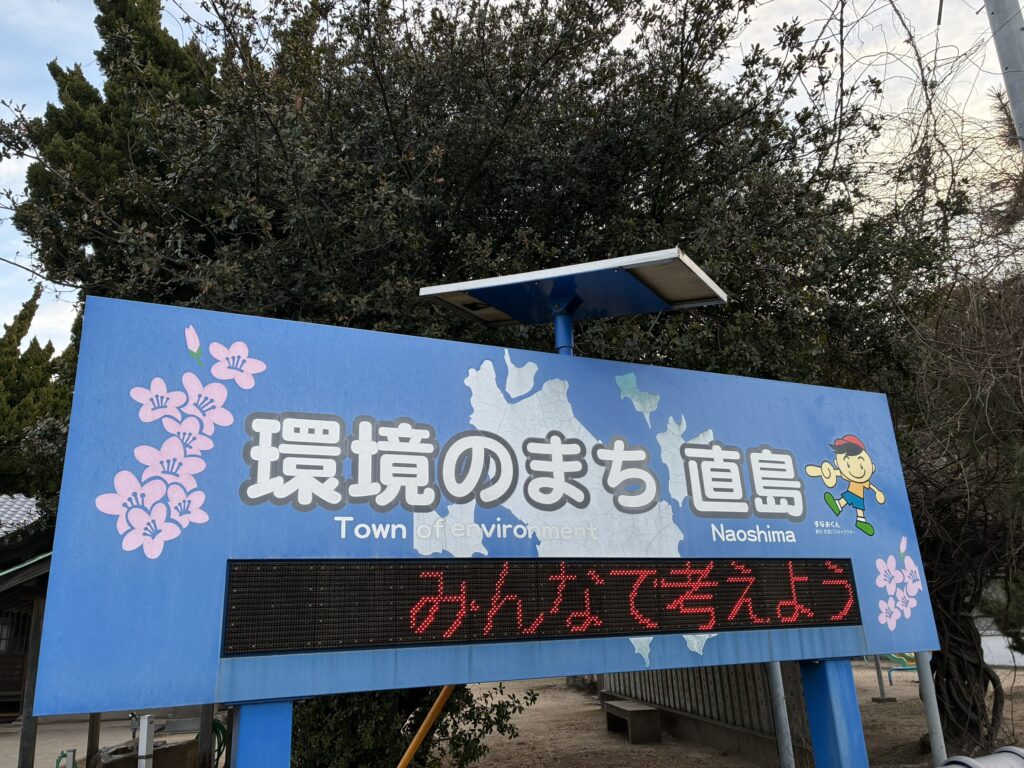 直島の玄関口に掲げられた「環境のまち」という看板。 それは、かつての過ちを二度と繰り返さないという決意の現れでもあります。